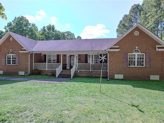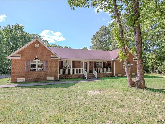 Custom-built, one-level, all-brick, 4-bedroom, 2-bath home sits on just over 13 acres down a long gravel driveway. You’ll love wildlife watching from the front porch which is 30’ wide with maintenance-free vinyl rails. The front door opens into a vaulted great room with hardwood floors, a stone accent wall and a gas fireplace which is perfect for cozy nights at home. There is a bay window in the dining room and sliding doors lead to the back deck. The kitchen has an island, over a dozen cabinets, and tons of counter space. The primary bedroom is large with 2 closets (1 walk-in) and a full ensuite with double sinks, jetted tub, and step-in shower. The 2nd and 3rd bedrooms are carpeted with large closets. The 4th bedroom is being used as an office with hardwood floors and an exterior door. The back decks have been upgraded with composite deck boards. The main deck is 16x30 with a secondary 12x12 deck for the hot tub, and a 11x30 concrete patio. There is an oversized 2-car attached garage and an oversized 2-car detached garage (being used as a workshop) with 384 sq ft of finishable space above perfect for storage, home schooling or an additional hang-out space. 1-2 acres of land are cleared and fenced -- perfect for gardening or playtime -- while the remaining acres are pristine woods. Shopping and dining opportunities are available in nearby Mineral and Louisa plus it’s only 20 minutes to Duke’s Marina and 30 minutes to Lake Anna State Park.