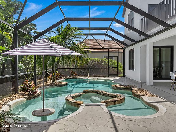 Experience refined coastal living in this 5-bedroom, 3-bath retreat with over 4,000 sq ft of beautifully upgraded space just blocks from the beach. Located in a gated community, this 2006-built home blends timeless style with resort-like amenities, including a gas-heated saltwater pool and spa. The grand foyer features soaring vaulted ceilings & an elegant chandelier. The main floor includes a primary suite with a soaking tub and shower, and guest suite. Upstairs offers 3 bedrooms, a bathroom, a bonus room, and a theater. The chef's kitchen boasts high-end appliances, soft-close cabinets, gas cooktop, custom walk-in pantry, and reverse osmosis system. Other highlights: hurricane impact windows and sliding doors, crown molding, Restoration Hardware lighting, 3 HVAC units, 2019 tile roof, and 2022 exterior paint. Enjoy a whole-house water filtration system, garage storage, lush landscaping, and an oversized driveway for extra parking. Community: resort pool, tennis, basketball, and park