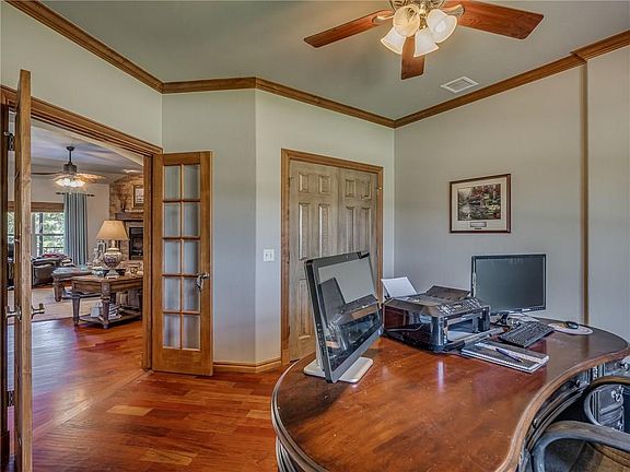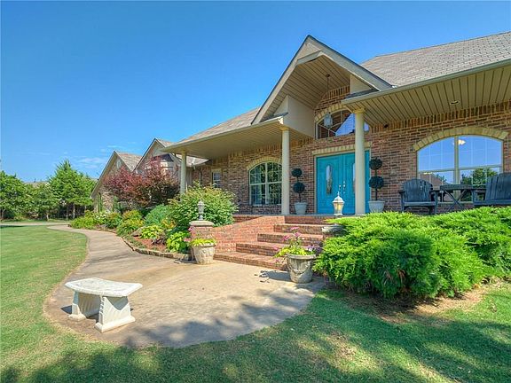 One of a kind property located in Rabbit Run on 1 ACRE with over 6,000 sq. ft., with walk-out basement, Grand entryway with large front porch, 5 bedrooms, 4 bathrooms, large living room with rock fireplace and huge windows, stunning kitchen with dining area, breakfast bar and center island, executive study and an additional flex office space with built-ins, bonus room, 4 car garage, Class 4 roof w/Impact Resistant shingles, a large balcony overlooking the gorgeous backyard oasis with a salt-water pool, diving board, cabana, & a stocked neighborhood pond nearby for fishing! Basement level has huge living room, theater room, bedroom, bathroom, and kitchenette. So much to list! The entire structure is built with monolithic walls, concrete from top to bottom! Utilities are low with this extremely energy efficient design! Water well included for lawn sprinklers and pool! Located close to shopping, dining, highway access, Tinker AFB, Boeing, Rose State College, & more.