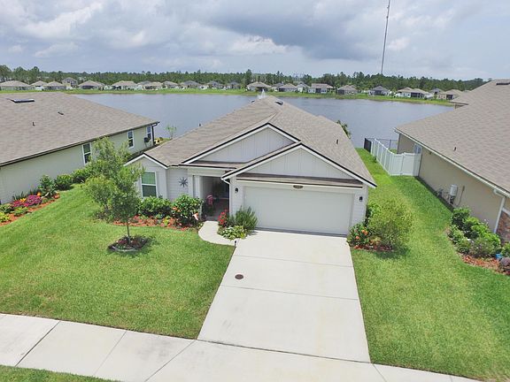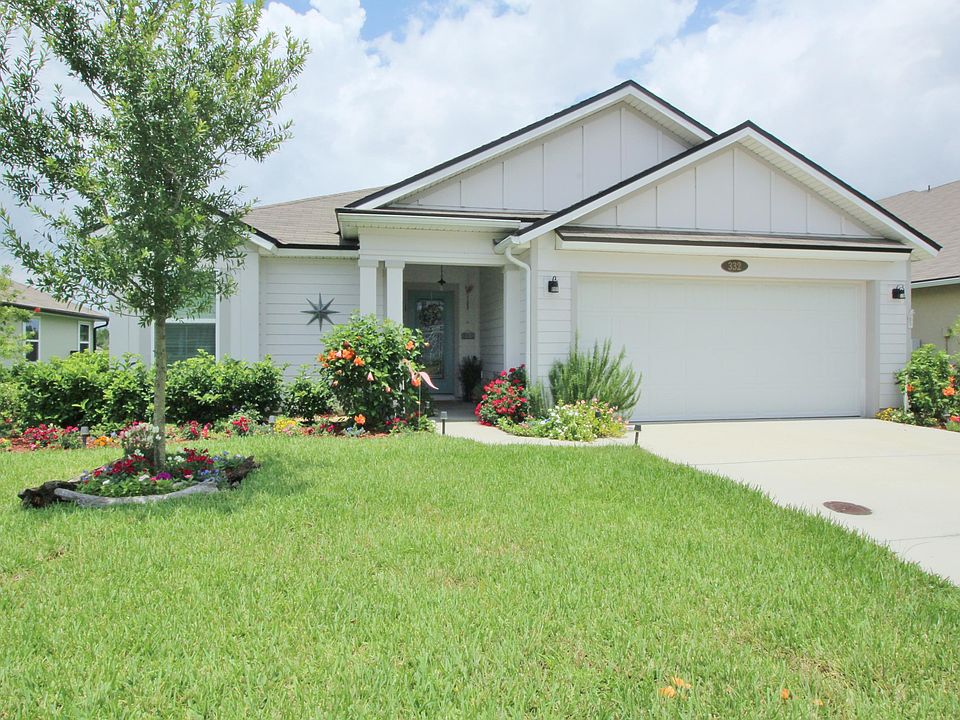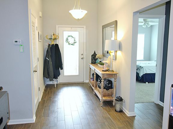 Lakefront in Deerfield Preserve! Move right in to this immaculate 3 bedroom, 2 bath home built to the same standard as the model home with eco-friendly natural gas for your appliances, open concept floorplan with desirable wood- look tile throughout, spacious kitchen with island, pendant lighting, quartz countertops, stainless appliances- including a gas stove and a walk-in pantry. There are also additional recessed lights and accent walls throughout this stunning home. The roomy master suite has a luxurious bath with large, tiled shower and a double sink vanity. Both guest bedrooms are spacious 14'x16' retreats. Beautiful landscaping enhances the front and back yard. You'll love the new slate stone patio and screened-in porch, great for enjoying your morning coffee or afternoon tea