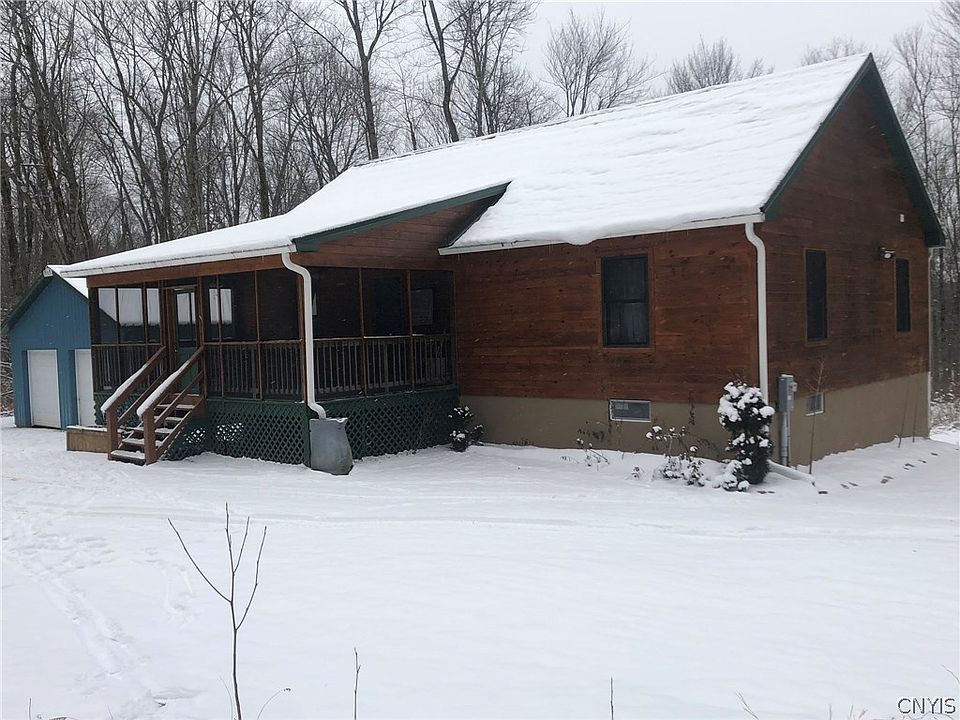 Country living at it's best! This home is located on a private wooded area with 7.73 acres of land. This home has much to offer such as 2 beautiful porches. One porch is enclosed for all season use and the other porch is open to beautiful view in back yard. Open concept living, dining room and kitchen with cathedral ceilings. Gorgeous pine and customized touches through out the home. It also offers a partially finished basement with second kitchen and second full bathroom could be used as in-law suite or for Air bnb. HUGE detached 2 car garage with lots of storage. Come take a look, this house will not last long!