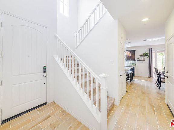 This beautiful 4 bedroom, 3 bathroom corner home located in the gated community of Terraza at Schaner Ranch features white bright modern tones, plantation shutters, recessed lighting and upgraded tile floors to make for an elegant space. It has been meticulously maintained to preserve its 5 year old new construction condition. The family room boasts large windows that allow an abundance of natural light to illuminate the open floor plan throughout. The kitchen features quartz countertops, full backsplash, espresso-stained cabinetry with several glass inlays, and a large center island with breakfast bar seating. The stainless-steel appliances include a gas cook-top stove and hood, convection oven, microwave and dishwasher. A downstairs bedroom and a bathroom with single vanity and shower complete the bottom floor. Up the stairs, a master suite with private spa-like bathroom features ceramic tile floors, separate vanities, walk-in shower with bench seating, soaking tub and offers 2 walk-in closets. Two generously sized secondary bedrooms (1 with walk-in closet and 1 with mirrored wardrobe closet doors) share a full bathroom with "Jack and Jill" bathroom. Convenient upstairs laundry room with sink and storage cabinets. Also featured are a two-car attached garage with direct access, tank-less water heater, rain gutters, and central A/C unit. Connections for buyer-furnished under-the-kitchen-sink reverse osmosis drinking water system, and water softener system are already in place for easier installation. Backyard with a covered patio area for entertaining and outdoor summer dining. Great location near markets, schools, and newly renovated restaurants plazas.