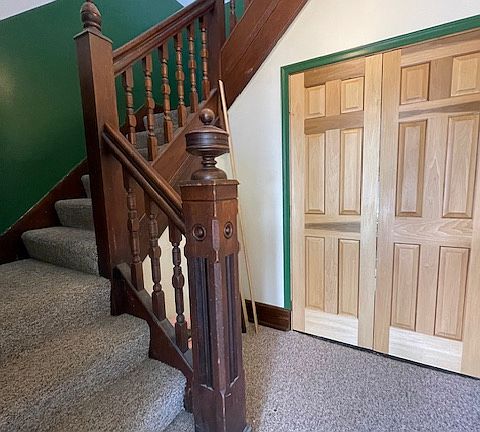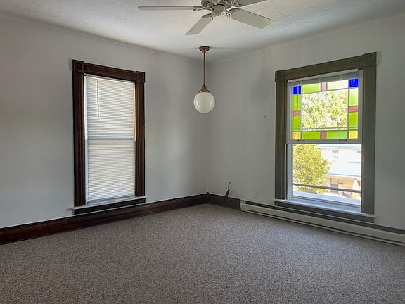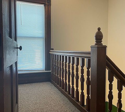 Up a beautiful staircase in an 1885 built house, this recently renovated one bedroom apartment has berber-carpeted living room, bedroom, hall, and upper landing, and vinyl in the kitchen and bath. The large bathroom has the original long clawfoot tub/shower, new vanity, and plenty of space for the provided washer/dryer. Lots of light in all the rooms from nearly floor to ceiling windows (some with stained glass), original trim, ample storage and closet space, a kitchen with plenty of cupboards and room for table and chairs--it all makes this a cozy yet roomy apartment with a view. You'll be only a few blocks from downtown shops, restaurants, grocery, library, drugstore, etc., and have a lovely city park just across the street. In the lot behind the house there is room for two cars. Lease is for one year with rent paid each month in advance. Renter pays for waste bagging (not collection), electric, cable/fiber, and water usage over $50 per month. This is a non-smoking apartment. Smoking on the property is prohibited.