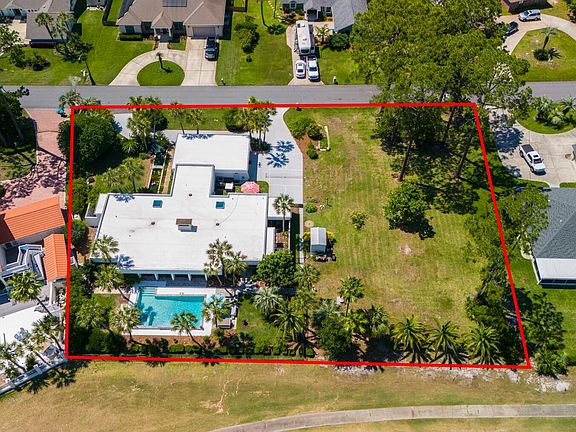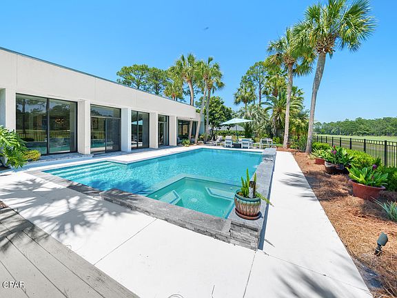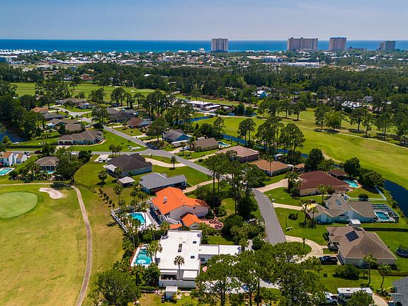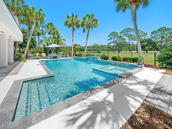 The master suite is a delightful retreat, with golf course view and access to the pool and patio. Adorned with custom lighting, custom blinds and custom drapes, wool carpet, floor to ceiling windows, the bedroom also boasts a beautiful private courtyard, with access to and from both the bedroom and bathroom. The bathroom features a free standing tub, separate tiled open shower, double vanities, double custom closets and the luxury of a heated bathroom floor! There's a sauna and steam shower just off the main bathroom. Two additional bedrooms, one with it's own private tiled courtyard, the other with a secluded outdoor sitting area overlooking the golf course with access to the pool and patio. The 16 x 32' salt water pool, new in 2020, with waterfall ledge, custom lighting and hot tub, provides the perfect place to relax, unwind and enjoy the peaceful surroundings and splendid golf course views. Additional rooms include two guest bathrooms, an office/study currently used as a music studio, and a bonus room currently used as a wine room. The home is energy star equipped with dual HVAC systems, a mini-split and three hot water heaters. The oversize double garage, circular driveway, plus additional concrete driveway, allow for ample parking of multiple vehicles, boat or RV. The extra land provided by the double lot affords the opportunity for numerous possible future uses, such as mother-in-law/guest house, or pickleball court. There is NO HOA. This house is close to Gayle's Trails, Pier Park for shopping and dining, a short distance to many local attractions and close to several beach accesses to enjoy all our beautiful local beaches have to offer.