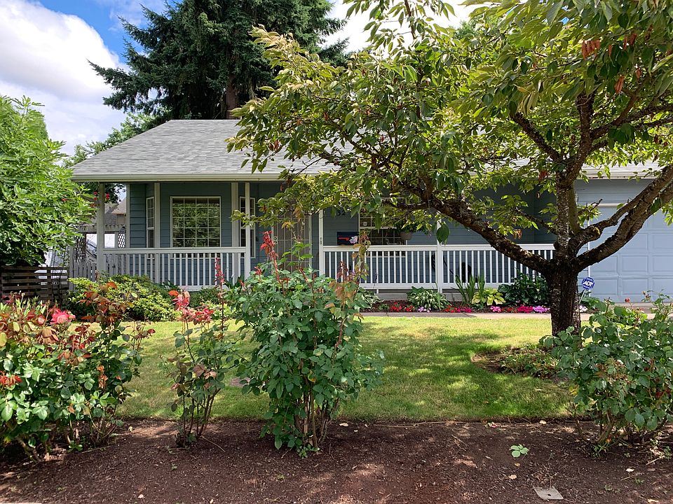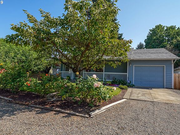 Charming Keizer home well-maintained and built in 1994. Beautifully landscaped front yard and covered front porch welcome you in to this single level 1104 SF home with 2 bedrooms and 2 bathrooms. Vaulted open floor plan. Both bedrooms feature walk-in closets. Slider to covered patio area for outdoor enjoyment. Separate shed in backyard. 1 car attached garage. Inside utility. Newer roof.
