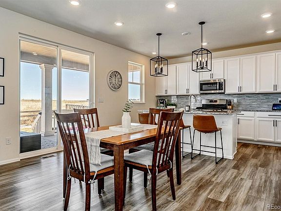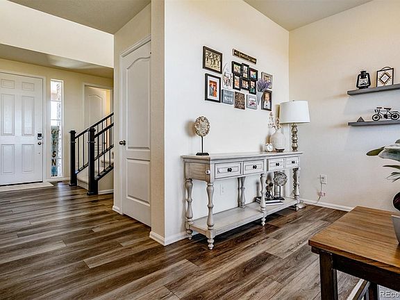 Welcome home to this better than new 2 story home in desirable Adonea. Beautifully finished w/ function & design in mind, this lovely home features an open floorplan filled w/ abundant natural light. The main floor features luxury vinyl plank throughout most of the main level as well as a bath. The spacious great room is open to the gourmet kitchen, perfect for entertaining. The gourmet eat in kitchen has been finished w/ granite countertops & offers an island for additional seating. Glass tile backsplash, stainless steel appliances, gas cooktop & 42-inch white cabinets complete this space. Don't miss the large pantry, great for additional storage. Refrigerator is included. Upstairs you will find 3 additional bdrms to include 2 ample sized secondary bedrooms along w/ a shared bath w/ dual sinks, along with an upstairs laundry room(washer/dryer included). The spacious master bedroom features a coffered ceiling & a private 4 PC bath w/ walk in shower & large walk-in closet. You will love to entertain outdoors. Enjoy the beautiful Colorado weather on the exterior extension of your home w/ a large covered composite deck, oversized professionally landscaped & fully fenced yard. You will love fun times w/ family & friends. The sprinkler system has a rain sensor to help save water. The oversized 2 car garage is finished & insulated & offers room for additional storage. The full unfinished basement is terrific for future finishing & has plenty of space for an additional bedroom or 2, bath & recreation area. The opportunities are endless. This Lennar home offers Solar as well. Your utility bills have never been better. Smart Lights in the great room, kitchen & dining area, Wi-Fi enabled garage door, Cat 6 Wi-Fi repeaters throughout the home & a Schlage keyless lock, too many upgrades to mention. Located just minutes away from DIA with easy access to I-70 and E-470. Residences of this wonderful community have access to several parks, trails, community pool & clubhouse.