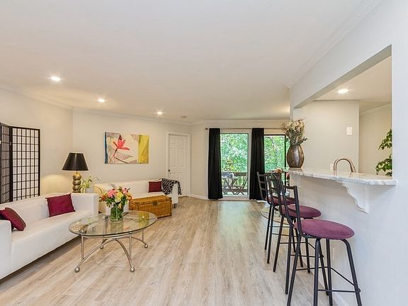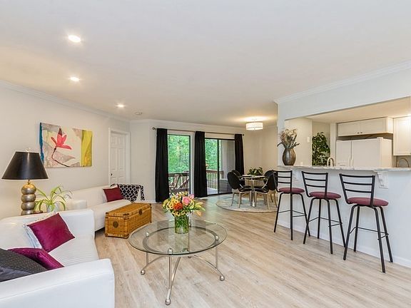 This stunning remodeled end unit at desirable Spyglass Hill Condo Complex with 2 bedrooms and 2 full baths will steal your heart! This first floor unit is so welcoming with one floor living, large windows for light, open floor plan and modern vibe! The light and bright Kitchen, with major remodel in 2019, has white shaker cabinetry, granite countertops, tile flooring, recessed lights and a breakfast bar! The spacious primary bedroom suite has hardwood flooring, large walk-in closet and remodeled bath! More remodeling includes all new flooring in living areas and bedrooms, recessed lights. See Upgrade sheet for details. Newer systems as high efficiency furnace, HWH, AC. In unit washer/dryer. Garage next to unit. All this plus an ideal quiet location at end of complex with private deck overlooking grassy area and woods, garden area. The complex has mature landscaping, is well maintained, and financially sound. Convenient to shopping, highways, train station and more. Call this home!