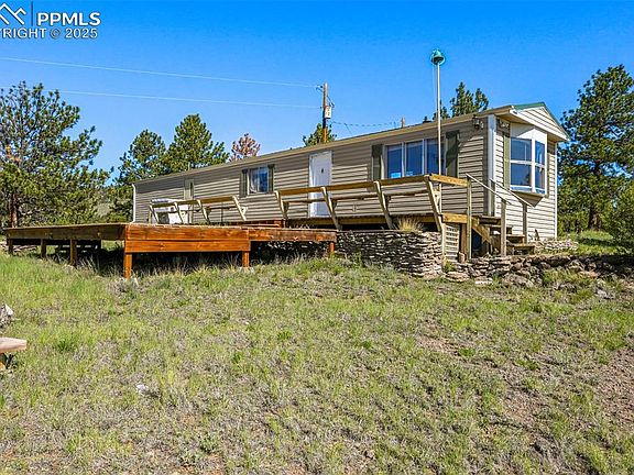 Affordable and versatile, this one-level home on 15 beautiful acres offers a peaceful escape with sweeping views of Pikes Peak. The interior is bright and open, with large windows and a cozy wood stove that makes the space warm and inviting. Step outside to a generous south-facing deck platform—ideal for relaxing in the sun, spotting wildlife, or enjoying a picnic. Recent infrastructure upgrades provide peace of mind for years to come: a brand new, county-approved septic system has been installed, along with a new well pump, modernized electrical updates to meet 2024 standards, and a new RV outlet. The property also features a 19'x23' powered shed/shop with an oversized door, plus an additional RV hook-up nearby. A highly desirable domestic-use well allows for legal watering of horses and small livestock. Recreation is just minutes away with easy access to public land on CR 100 and a short drive to 11-Mile State Park and Reservoir. Whether you're looking for a starter home, a mountain retreat, or an investment with room to grow, this is a rare opportunity to own a larger parcel in one of Colorado's most scenic regions.