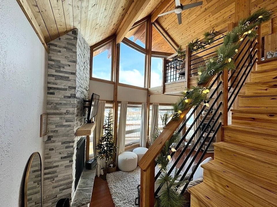 This signature 3-bed, 2-bath cabin offers the most breathtaking views in all of Brian Head, overlooking the lake, Giant Steps Lodge, and the ice skating rink, where you can hear the music and watch skiers carve down the slopes.