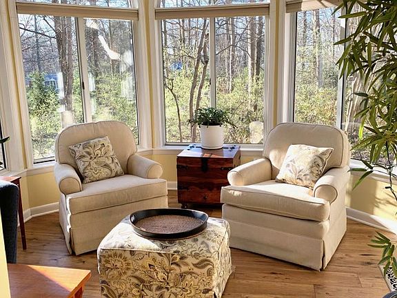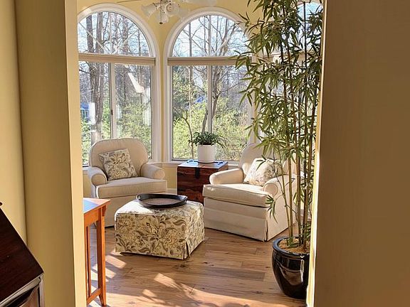 Peaceful contemporary on private, wooded 1+ acre lot in an intimate enclave which backs onto conservation land. Open, light filled living spaces with beautiful hardwood floors, vaulted ceilings, skylights, wood burning fireplace in living room and a gas fireplace in great room. Sunroom/office looking out over front gardens. Main floor primary boasts two walk-in closets, newly updated ensuite featuring walk-in shower, double vanities and HEATED floor! Move right out of your primary suite to a Hot Springs, salt water therapy hot tub . Open great room with gas fireplace, and built-ins. Exit through the glass sliders leading to an idyllic screened-in porch with composite decking, two ceiling fans all looking out over a custom perennial garden. Additional deck and patio leading around to the side yard hot tub complimented with a fenced back yard. Privacy abounds with additional acreage in wooded setting. Main floor laundry and guest powder room. Two additional bedrooms and full bath on 2nd floor with large double closets. Downstairs features the fourth bedroom, a full bath and large additional room with access to outside steps. This bonus room (350 sq. ft.) is suitable as a playroom or workout areas but is not included in the total finished square footage of the house. This house boasts more than ample storage and closets along with an oversized two car garage. Accessibility features include: accessible light switches, stove and counters, larger doorways, and ramp in garage. Buyers have no worries with a new efficient gas furnace (2023). Additional updates include architecture shingled roof (2014), fenced backyard, screened-in porch with wolf flooring (2014), Kitchen Aid double ovens, refrigerator and dishwasher (2015), and hot water heater (2018).
