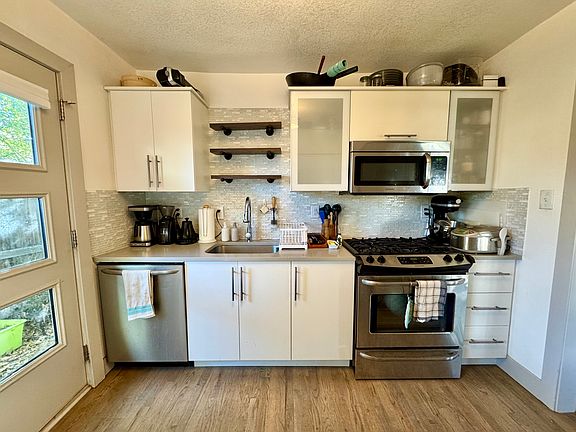 In-unit washer and dryerGas range stoveStainless steel appliancesHosting summer bbqsTile backsplashModern kitchenPantry storage