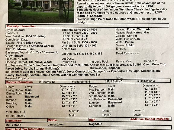 Great family floor plan! Fabulous large all year sunroom off kitchen. Walk out of in-law bedroom or entertainment area of basement to the HUGE fenced back yard! Lease/purchase option available. Take advantage of the opportunity to own 1.50+ gorgeous wooded acres in Old Sedgefield; Host of the famous Wyndham Classic. Indulge in a day at the spa or Choose from 2 courses at Grandover resort. LOW COUNTY TAXES!!!