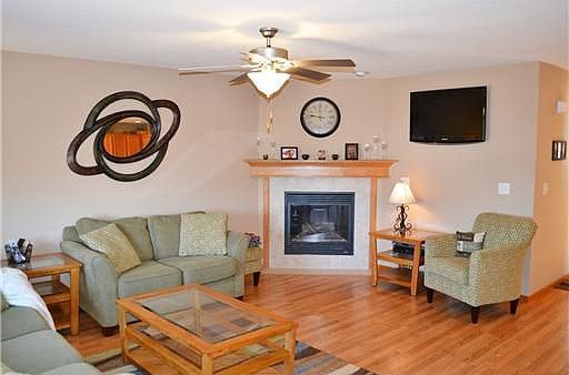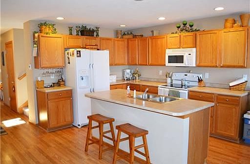 Adorable, well-maintained 2 story home in a desirable neighborhood! Laminate wood floors throughout the foyer, half bath, great room and kitchen. Spacious great room features a corner gas fireplace with tile surround and oak mantle. Large kitchen next to the great room with an island, oak cabinets with brushed nickel hardware, a side-by-side fridge, lots of counter space, dining area, and sliders to the deck. Up the stairs you'll find the large master suite with walk-in closet, dual sinks, and vinyl flooring. 3 additional spacious bedrooms and a full bath complete the upper level. Lower level features a rec room that is perfect for entertaining, lots of storage space, and is stubbed for a bathroom. Nicely-landscaped backyard with a privacy fence and storage shed. New roof and gutters in 2011. Large 2 stall attached garage with tons of shelving. Don't miss out on this great home in a wonderful location!