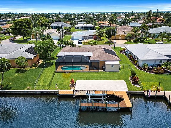 DIRECT GULF ACCESS 8 Minutes to the River, NO STORM DAMAGE West Facing, NEW POOL & CAGE, NEW 10,000 lb. CAPTAINS WALK DOCK WIITH CANOPY, New granite kitchen cabinets, stainless appliances, breakfast bar, pantry, New updated baths!, Vaulted ceilings, NEW ROOF, gutters & soffits 2018, updated plumbing 2018, New electric panel with generator hook up 2018, updated A/C, three bedroom split plan home, Newer tiled floors, crown moldings & baseboards, vaulted ceiling family room, living room / dining area with electric slate wall mounted fireplace, sliders out to a beautiful Newly installed 4 year old screened salt water solar heated pool with pool bath, faces West, master bedroom includes a slider out to the lanai & a large walk in closet, New updated bath with double high top granite vanity, new lavatory & a new porcelain tiled walk in shower, there are two nicely appointed guest bedrooms with walk in closets & another updated hall bath, permitted shed, auto sprinklers, New hurricane shutters 2022, security system with cameras, extra wide driveway, close to I-75, airport & Fort Myers Beach,! a must see home for the $$$
