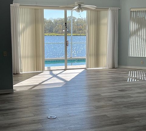 Lakefront pool home conveniently located across from Publix Corporate Offices, near Hwy 570 and Lakeland Regional Airport. This 3/2 home boasts open split floor plan with ceramic tile flooring, vinyl plank and carpet throughout the interior. The large eat-in kitchen has expansive countertop space and plenty of storage. The master suite features walk out to the pool, double vanities and garden tub. Private pool looks out to gorgeous lake. Home is on a quiet cul-de-sac. Carillon Lakes features gated and 24 hour security, clubhouse, community pool, tennis courts, fitness center, recreation areas, walking paths, spa hot tub and playground. Owner pays HOA, cable, internet, lawn care and pest control. Renter pays electric, water, gas and pool maintenance. No pets or smoking/vaping allowed. One year lease required with background and credit check. Renter to pay background/credit check fee.