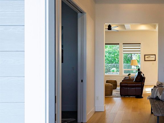 Welcome to your dream home with a coveted privacy lot, back yard is open space to Dry Creek—NO builds behind you, ever! This beautifully crafted residence combines elegance and comfort, featuring open living space with designer elements. The custom kitchen includes quartz slabs, fine tile, and ceiling-high cabinetry. The master bath offers dual vanities, a soaker tub, a spacious walk-in shower, and sleek finishes. Attractive Karastan wood floors add warmth throughout. The layout includes three generous bedrooms plus an office, providing open space for study, sleep, and storage. The expansive great room transitions to a covered patio, perfect for outdoor living. Lots of windows flood the interior with natural light. The privately located master suite is a true retreat with coffered ceilings and a stylish master bath. This home has a three-car garage with plenty of space for vehicles and storage. Experience comfort and privacy in this exceptional home!