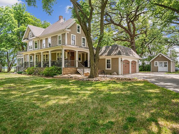 Exquisite Country Estate! This beautifully renovated home showcases upscale finishes with an elegant country feel. Complete with wrap-around covered porch, the home features a gorgeous gourmet kitchen with custom cabinetry and high-end appliances, spacious living areas, sun-filled sitting room, main floor office/bedroom, open staircase to the upper level offering both a luxurious primary suite and guest room. Enjoy a spa-like experience in the primary suite featuring a sitting area with FP, walk-in custom cedar closet, luxurious bath with dual vanity, soaking tub, dual-head walk-in shower and heated floors, plus savor sunrises and coffee on the private balcony. The finished lower level offers another bedroom suite, along with a generous family room with gas FP and kitchenette. You'll relish the heated attached garage; heated and AC workshop; plus several other outbuildings all on 6.9 private acres. Looking for a peaceful country home loaded with custom touches? This one has it all!