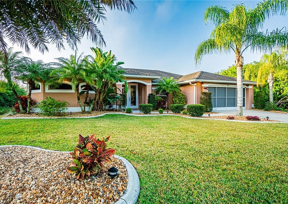 This absolutely beautiful 3-2-2 home on a freshwater canal offers a oversized caged pool with beach entry, tiki bar for entertaining,exquisite landscaping, ceramic tile, large kitchen with upgraded appliances and a abundance of cabinets, den with French doors, a huge master bath, home warranty and so much more