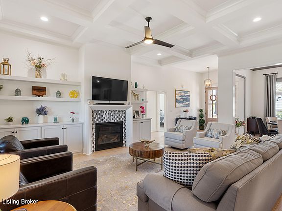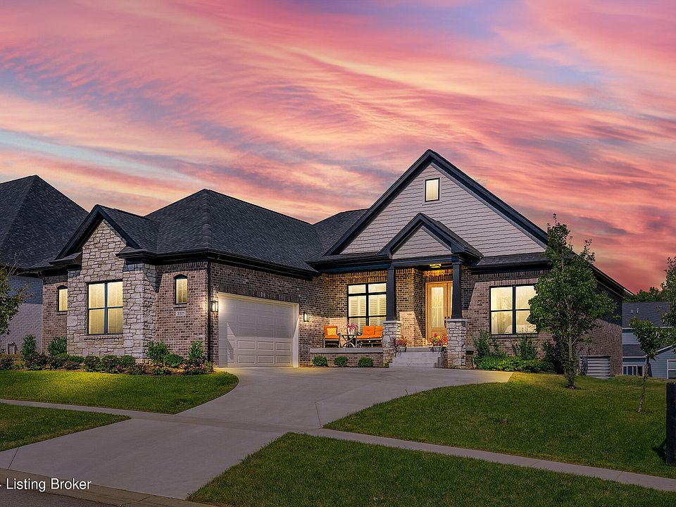 SELLERS ARE MOTIVIATED! Built as the Mason Custom Homes model in 2022, this light-filled brick and stone ranch with finished basement in Catalpa Farms is a stunner! This one has ALL the upgrades: 10-foot coffered ceiling, upgraded kitchen & bourbon bar area, upgraded lighting throughout, beautiful hardwood floors, wood accent walls and MORE!! Quality construction and upgraded materials!! The covered front porch leads you to the beautiful glass front door which opens to the foyer. Tons of light spills into the open plan living room with 10 foot coffered ceilings. The upgraded kitchen with large island, gold accents, beautiful backsplash & quartz countertops is a cook's dream - complete with pot filler! Throughout the home, the seller has made quality choices and upgrades. The finished basement offers a 4th guest room, a full bath, a family room, and what could be a media/movie room. There is a huge additional unfinished space for storage (area currently used as workout space). Catalpa Farms is conveniently located (10 mins from the 265/64 interchange and 8 mins from the Outlet Shops) and provides a dog park and playground area.