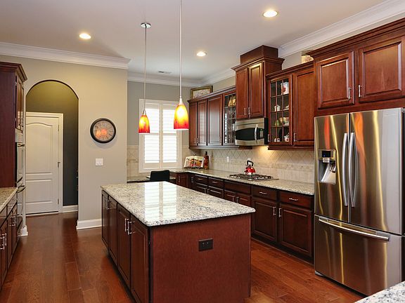 Gorgeous downstairs master home 1.5 miles to Cary Crossroads shopping & dining! Energy Star Certified, 3 car garage on large .95 acre cul-de-sac lot! Coff'd ceiling, hardwoods, transoms, 2-story foyer & family room, arched entries, oversized windows, plantation shutters, 3M solar window tint, Mohawk Premium carpet, comm. grade cooler installed in center kitchen island, granite counters, stainless appliances, NG cooktop, double wall ovens, first floor master w/sitting room, fireplace & spa bath!