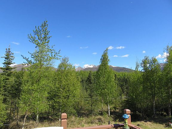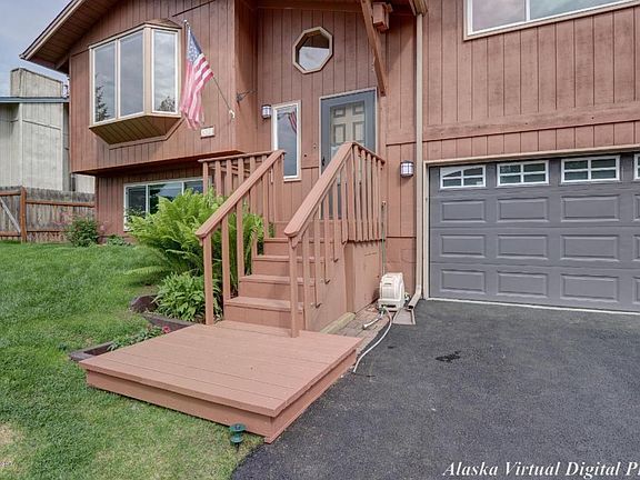 Great location being backed up to military reservation and less than 1 block from park - fantastic views of Chugach Mtns. Totally updated home with new windows & laminate floors, huge kitchen w/SS appliances, Privacy access from master bedroom to bath. Brand new driveway, Enlarged deck to enjoy the sun and views, greenhouse, storage shed, spacious sized LR with bay window with window seat, Extra deep dbl garage with work shop space and storage at one end. Security system, Light and bright - An opportunity to have privacy and views at the same time. RV parking area.