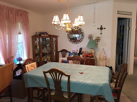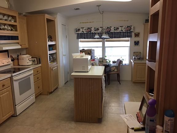 This is a Mobile Home in a 55+, Gated, Pet Friendly community on a rented/leased lot. This rare 3BR/2BA 2001 Palm Harbor has a 2 car garage and sits on a desirable perimeter lot. There is no neighbor and a large grassy area to the south; its within walking distance to one of two clubhouses and pool. There is ample room for living, dining and entertaining. All appliances are included in the sale. The home is being sold unfurnished. This home is an open living room/dining room/kitchen combination with tile and carpet floors. There are vaulted ceilings and the 2013 A/C keeps it all cool! The kitchen is a Chef's delight! The kitchen has 12" tile flooring. There are plenty of cabinets and cupboard space and a center island for food prep. There is a separate indoor laundry room in the hall with tile floor and cabinets. The washer/dryer are included in the sale. The master bedroom has carpet, a ceiling fan and vaulted ceilings. The master bathroom features dual sinks and a linen closet with 12" tile floors. There is a walk in shower. The 2nd and 3rd bedrooms have carpet, ceiling fans, vaulted ceilings and closets for plenty of storage. The guest bathroom features a tub/shower combination, single sink vanity and 12" tile on the floor. The home has a rare 2 car garage for housing your valuable toys. There is a driveway for 2 or more cars. The lot rent is between $896 a month and includes lawn mowing, edging and blowing and all the community amenities below. Ridgewood Estates features 24/7 guard gate, 2 Clubhouses; 2 Pools; Hot tub; Shuffleboard & Tennis court; Library; Billiards Room, Work out room, with a 7 day calendar of events to take part in. Come join in the Fun!
