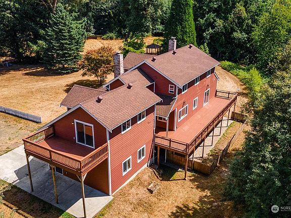 Spectacularly updated 4+ bed/3.5 bath home w/ decks and patios to enjoy every angle of the homestead. Living room showcases wood stove for chilly PNW days. Open concept Kitchen and Dining w/ island, dual ovens, stainless appliances, artisan brick work w/ luxury plank flooring throughout. Main level boasts 1/2bath, laundry, office, primary with deck access, private bath and walk in closet. Upstairs 3 more spacious bedrooms, full bath, great room, and storage. Lower level daylight basement with 3/4 bath & walk out patio & separate fenced yard. Great for MIL suite, or… Massive barn with stalls, and shop space. Large out door kennel for pups. Great income opportunity! Fantastic well water, forced air furnace and heat pump/AC! Welcome Home.