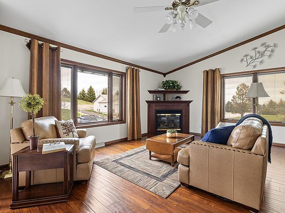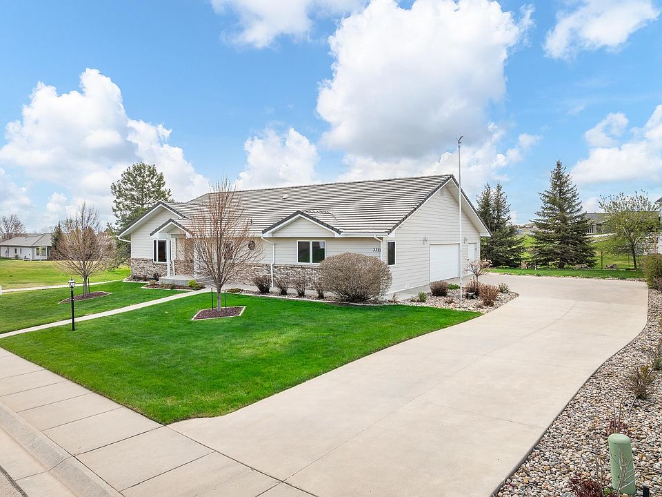 Listed by Jeremy Kahler, KWBH, 605-381-7500. One level living at it's finest in this immaculate ranch style home in Elks Country Estates! *The uninterrupted main living area has a large living room that flows into the dining and kitchen areas- making entertaining a breeze *12' vaulted ceilings, beautiful wood floors and great natural light in these spaces *Chef's kitchen has beautiful cabinetry with crown molding, ample counter space, stainless steel appliances, a large island and breakfast bar for added seating *Cozy breakfast nook for convenient dining space, with views of the golf course *Private master suite in back corner of the home, with a large bedroom, ensuite bathroom with walk in shower, and a walk-in closet *Second bedroom, a convenient home office/bonus room, bathroom and a laundry room on other end of the home *Attached garage has space for 2 cars, plus a 3rd stall for golf cart or smaller car, and is insulated and finished, heated and cooled, and has work/storage space *Entertain with ease on the partially covered back Trex deck, overlooking the yard with professionally curated landscaping- including mature trees with concrete curbing, decorative rock areas with perennial plants, and a lawn maintained by a sprinkler system and mowed by the HOA *Low maintenance exterior and a concrete tile roof. Nestled on a 1/3 acre lot next to golf car pathway and overlooking the 13th green of Rapid City Elks Golf Course, this home is a gem- call today!