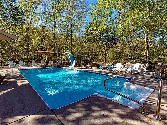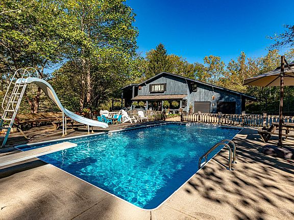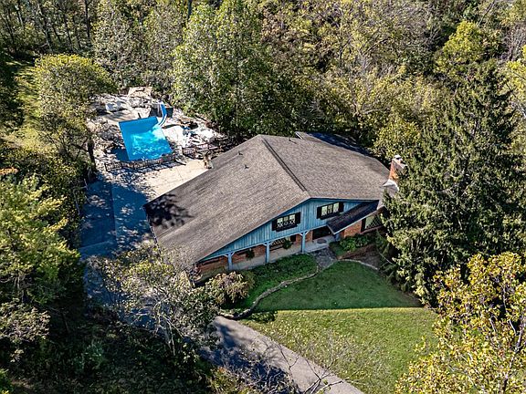 Privacy plus on 1.77 acres +/- brick /cedar contemporary style home with covered back and front porch, nice, wooded setting with small creek. Nice inground pool with slide and lots of decking. 2 story home with raised living room, nice brick fireplace, beamed, cathedral ceiling in living and dining rooms. 8 rooms, 4 bedrooms & 2 1/2 bath, 2400 Sq Ft per owner. Many surprising extras in home. 2 year old HVAC, Roof 10 years; Home warranty offered.