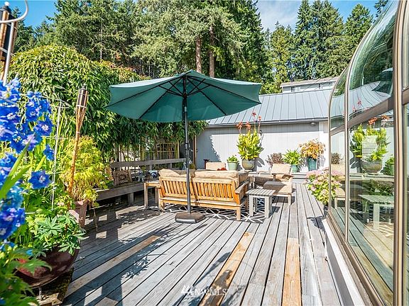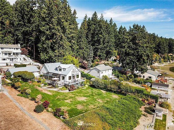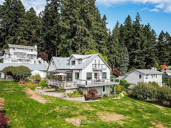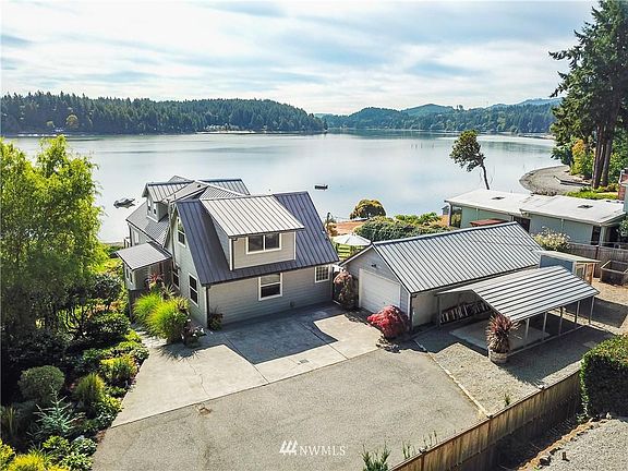 Spectacular 126' low-bank waterfront setting, beautiful grounds lawns, pebble beach and well maintained, nicely appointed home. Shoreline has low concrete bulkhead and a low-bank entertainment area, easy steps to beach. Very conveniently close to town. Wonderful , broad water views from all the main living areas. Large decks and patio for entertaining, fruit trees, garden area. Detached garage with RV storage and workshop. Beautiful solarium dining room with amazing southerly water views. New furnace and heat pump in 2021 for economy and comfort, private well with new pump. Possible additional dwelling downstairs.