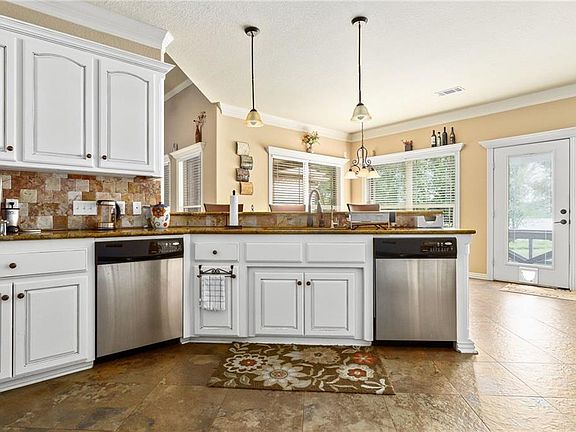 Enjoy gorgeous sunsets over Lake Jack Nolan...this one level home could be 4 or 5 bdrms...3 1/2 baths...it has 2 large living areas that open to the amazing kitchen..tons of storage and a great walk in pantry...3 car garage, big master suite with pretty view of the lake...relax or fish from your own private dock....what a great place to call home!!
