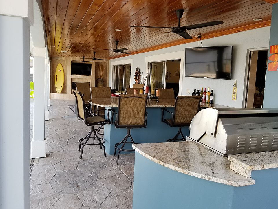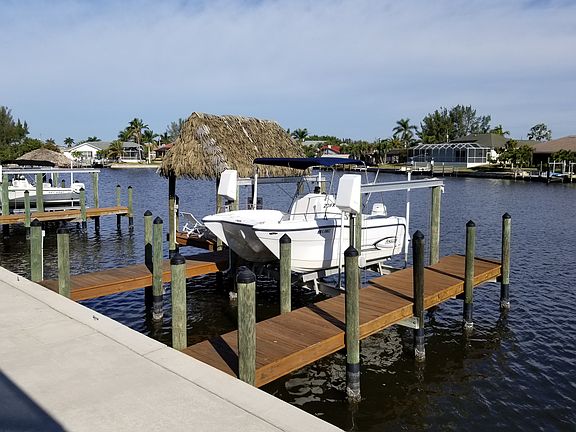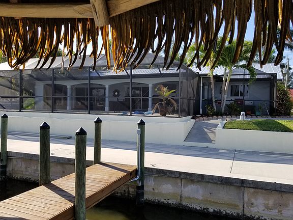 Direct access pool home on Massey Lake with a beautiful view. 15 minutes to Matlacha Pass. New Impact windows, Metal Roof, AC, water heater, etc. All plumbing has been replaced with PEX system. New kitchen 3 years ago with granite counter tops. Huge spectacular lanai with summer kitchen, large granite bar area, and a large separate living area. Lanai includes a travertine entertainment center, cypress ceilings and fans throughout. Large dock, synthetic thatch tiki hut, boat lift, and huge concrete captains walk. Inside is a 3 bedroom, 2 bath with large open great room w/wonderful water views from the kitchen, dining and living rooms. Crown molding throughout, knotty alder doors, travertine floors, etc.. Generous sized 2 car garage w/additional storage area. All assessments are paid.
