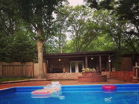 Looking for a unique home with tons of privacy? This 2 bed/2.5 bath all brick home is loaded with character. Main level has open concept great room with 2 story floor-to-ceiling brick fireplace, beamed ceilings & stained glass. Large bonus room/office, 3/4 bath, laundry & wet bar for entertaining. Head upstairs to find the open concept living area and family room with wood burning stove & updated kitchen with center island. The large master bedroom has loft concept with dual closets. Another good sized bedroom and guest bath round out the upper level. Step out back to a covered patio and your own private oasis! The large partial brick fenced in backyard offers an in-ground pool, fire pit, Pool house with workshop, cabana with dry bar & complete privacy. Oversized 2 car garage has room for all your toys. Drive-thru driveway for easy entry. Just 20 minutes to Scott AFB! This home has updated electric & new water heater.Home has already passed Municipal Occupancy. Being sold AS-IS.