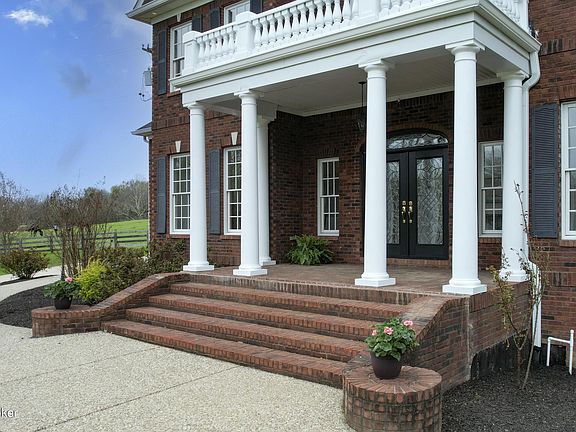 Grand full brick Colonial with sprawling front steps and large front porch with soothing views of the rolling 2+ acres with large Sycamore trees, flowing creek and beautiful horses. This stately home boasts 5 bedrooms, 4-1/2 baths and 5 fireplaces. You will entertain in style in the large expansive chef's kitchen equipped with 2 refrigerators, 48'' gas range, and 2 ovens. The beautiful white kitchen with granite countertops is open to the 2-story family room and offers plenty of space for everyone while keeping everyone out of the cook's way. You will find a butler's pantry/bar, office, dining room, 1/2 bath and main floor laundry/mud room all on the main level. You can enjoy the enclosed sunroom with woodstove and wood plank ceiling while watching the horses at the back fence, bring them a snack! Upstairs is the primary bedroom suite with double sided fireplace. The ensuite primary bath has dual vanities, walk in double shower, jetted tub and and large walk-in closet with custom cabinetry. Two additional oversized bedrooms each with their own private baths completes the second floor. The walk out lower level with 3 sets of French doors offering plenty of natural light. You will find two bedrooms, full bath with double sinks, fireplace, Theatre Room, kitchenette with island, granite countertop, refrigerator, Advantium oven and sink, laundry room, unfinished storage room and a storm shelter. Home has a 50 gallon hot water heater, dual HVAC system, 9 year old roof, brand new septic system and 3 car attached garage with entrance right into the kitchen area for ease of grocery unloading! Award winning North Oldham School District! Membership at Nevel Meade is optional.
