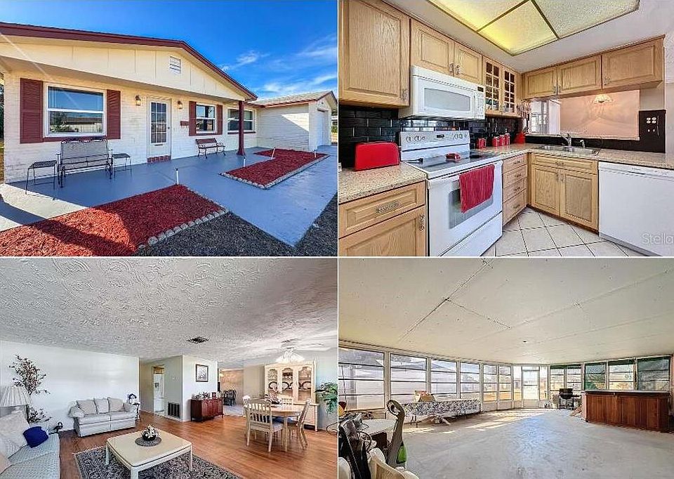 Welcome to this charming 2-bedroom, 2-bathroom home with a convenient oversized 1-car garage, located on a spacious corner lot offering ample room for your boat or RV making it ideal for outdoor enthusiast. Step inside to discover a large open area for your dining room and living room with beautiful newer windows. You will then enter the updated kitchen with newer cabinets and Coran countertops. To the side of the kitchen is a dinette area and a nice den space to relax after a busy day. This home provides two bedrooms that includes a main bedroom that is a true retreat, complete full ensuite bathroom, offering privacy and comfort. The second bedroom is large as well featuring a walk-in closet. This home also comes with a large, enclosed patio area for fun and entertainment. You will also find a third room with A/C off the patio with its own entrance. This room is currently used as a laundry room but has been a guest room in the past. This house is move in ready, but it can use some updating, and you can put your personal touch on it to make it your home. Schedule you're showing today and imagine the possibilities. This home is in a no flood zone area and made it through both recent storms with no flooding or damage.