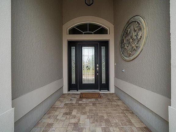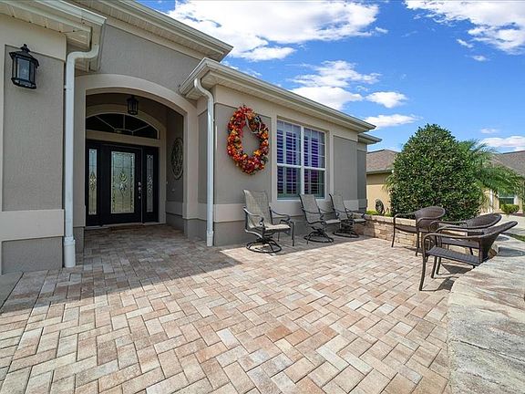 Welcome home to this beautiful 3 Bedroom, 2 1/2 Bath Bridgeport designer home in the sought after in The Village of Collier. As you approach the home, the charming courtyard catches your eye, inviting you to relax with a glass of wine. Upon entering this well-maintained home, you are welcomed by a spacious foyer. To the right, you will find two generously sized bedrooms, each equipped with closets & ceiling fans, along with a conveniently located Jack and Jill bathroom. This bathroom features a walk-in soaking tub complete with lighting and jets, which has just been serviced. As you proceed into the main living area, you are greeted by a large living room adorned with plush carpeting, a tray ceiling, and a ceiling fan. A half bath is conveniently situated within the main living space. The chef's kitchen is a delight, showcasing staggered cabinetry, modern appliances, a central island, and ample preparation space. The dining area is enhanced by large windows and a tray ceiling, providing a bright and airy atmosphere. The enclosed lanai, equipped with a mini-split system, windows, automatic shades, and privacy hedges, offers additional space for living and entertaining. The owner's suite is spacious, featuring a tray ceiling with a fan, three large windows, and two walk-in closets. The attached ensuite bathroom includes a roll-in tiled shower with a seat, a linen closet, a makeup area, and a water closet that boasts an upscale bidet. This home also features an exceptionally tall garage opening exceeding 7 feet, accommodating taller vehicles. Additionally, the garage is air-conditioned with a mini-split system for added comfort. You will appreciate the personal touches throughout the home, including plantation shutters, window treatments, tinted windows, upgraded 80-gallon hot water heater, and roof replaced in 2024. Do not hesitate—call today to arrange your personal tour and make your dream of living in the Villages a reality today. A short golf car ride to the popular Lake Sumter Landing Market Square, and centrally located to multiple golf and recreation areas, this home is in the heart of it all.