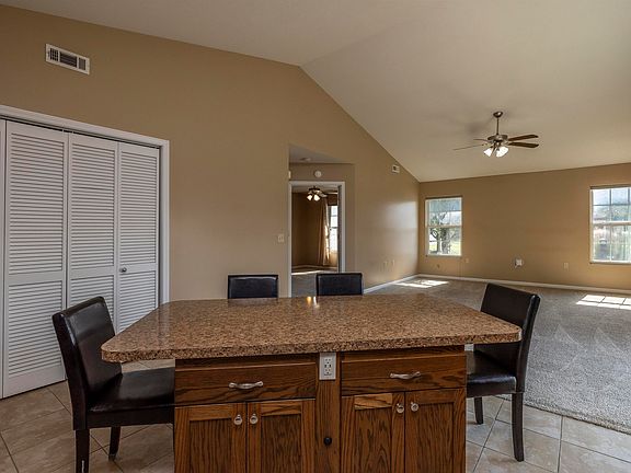 Fantastic main-floor living home with almost attached two car garage! Nice open floor plan for your living, dining room and kitchen all sitting nicely under huge vaulted ceilings. Large primary is ensuite with walk-in shower and walk-in closet which is also safety built in the middle of the home for storm shelter. 2nd bedroom is adjacent to the 2nd full bath with tub and also hosts the laundry machines, tucked away behind a door. Nice sliders from the dining area and a great front porch which leads to the garage and extra storage. This will go quick, get your showing booked asap and get ready to move on in!