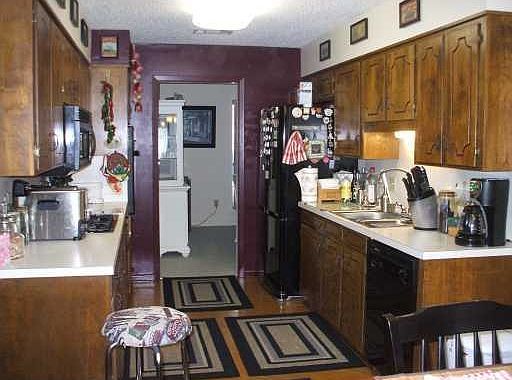 Large 4 bedroom two bath home has separate dining, large kitchen open to hearth/sun room. Large deck off sun room has gas grill. Roof replaced April 2014. One of the bedrooms could be an office with built in shelves. Home gas wood burning fireplace with gas logs in the den. Home has duel zone air and heat.