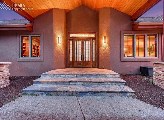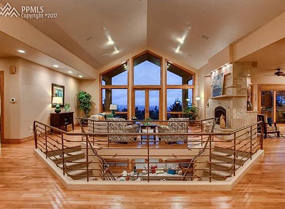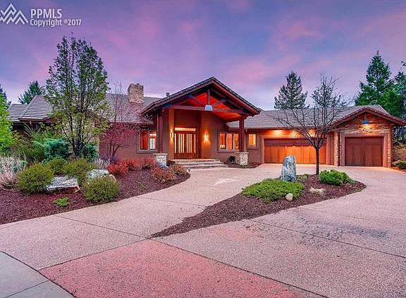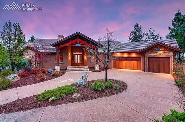 This unique custom home is nicely tucked away on a very private lot offering spectacular views of the city and Garden of the Gods. Beautiful architectural details and designed with custom finishes throughout. Ideal open floor plan and fabulous outdoor living areas. Impressive curb appeal with circular drive and covered flagstone entry. Upon entry you are welcomed to a beautiful great room showcasing the majestic views with floor to ceiling windows, vaulted ceilings, cherry hardwood flooring and one of 5 fireplaces. Great room has French doors leading to the covered deck. Connecting to the great room is a grand scale gourmet kitchen with a hearth room, fireplace and artistic centerpiece over the cooktop that truly is a work of art. Custom cabinets, granite slab countertops, walk in pantry, custom full sized refrigerator and freezer and walk out to back deck with built in grilling area. Nice formal dining area with built is storage and serving bar. Large laundry room just off the kitchen. Main level office is gorgeous with custom woodwork. Your Master suite is the ideal space to retreat. Wake up to your lovely views, step out on to the deck off the master, soak in your tub with the fireplace, or take on the day and find the perfect outfit in your well organized/custom designed closet. As you head downstairs you will notice the tasteful iron railing. Lower level family room with cozy fireplace, wet bar and walk out to the back deck nestled in the trees. Three additional good size bedrooms all with their own private bath and all above grade so lots of light. Additional large interior room which is great for a movie room, work out room or craft room. This was the builders personal home and he did it well. Tucked away off Hydra in a newer section of Top of Skyway.