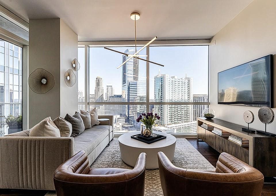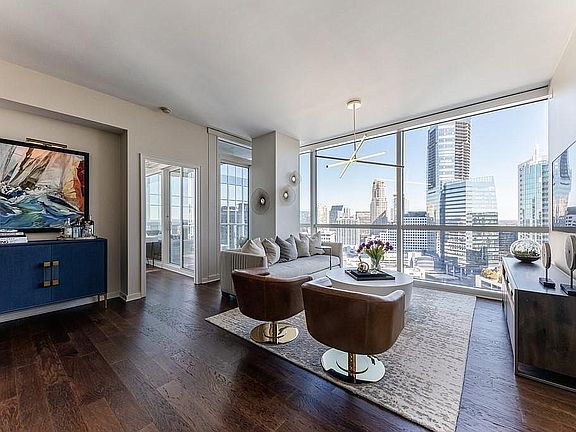 Come home to Buckhead’s premier residential property and enjoy this truly one of a kind two-bedroom suite with a floor plan that offers options only found in the buildings three-bedroom homes. This 20th floor corner unit is positioned in a three-bedroom stack with North, East and West exposures. This home has a wonderful long formal entry foyer, ideal for displaying art. The foyer leads to a dramatic open living, dining and kitchen space where a wall of windows (9.5 feet ceiling heights) provides for a spectacular view of the Buckhead skyline and beyond. Also unique to this home is the oversized balcony space (the same size as the three-bedroom stack) which can accommodate both group seating and dining. The balcony can be accessed from both the living room and second bedroom. The home has recently installed wide plank walnut hardwoods throughout the living space and in both bedrooms along with new ceramic hardwood tile in both bathrooms. At the same time both showers had stone inset floors installed. The focal point of the living space is the open kitchen, ideal for inclusive entertaining. There are premium Wolf stainless steel appliances (including gas stove) and a counter depth built-in Sub-Zero fridge. The recent kitchen renovation added immaculate granite counters (including center island), tiled backsplash and a stainless steel undermount farmhouse sink with pull down faucet. Premium ceiling mounted contemporary designer lighting fixtures are installed in the living room and both bedrooms. There are additional upgraded lighting options throughout the home, many positioned to highlight artwork. The two large bedrooms are on opposite sides of the living space and both offer incredible dramatic views of the Buckhead skyline. There are high end solar shades installed in each of the bedrooms and both have custom built in closet systems. Both spacious bathrooms have quartz counters with undermount sinks, solid hardwood cabinetry and premium fixtures. There are oversized seamless glass shower stalls in both of the bathrooms. The owner’s suite bathroom does have double vanities and an en-suite toilet. There are designer lighting and mirrors in both of the bathrooms. There is a laundry closet off the entry hallway that has oversized stacked (Samsung) washer and dryer. The HVAC system was recently replaced, and a Nest thermostat added. The home comes with two premium side by side covered parking spaces in the secured garage. Terminus Condominium was built to commercial grade standards by Tom Cousins, of Cousins Properties, Atlanta’s premier commercial developer. All of the units have solid core doors and are built to minimize any noise transmission between residences. All of the homes feature Smart Home technology systems. The 14th floor amenities level has a saltwater pool and hot tub, a dog park, grilling stations, catering kitchen, club room, media room, fitness center and two guest suites. In addition to onsite property management, there is a 24-hour concierge and valet parking for both owners and their guests. With Terminus’s central Buckhead location (corner of Peachtree Road & Piedmont Ave) you are just steps from Atlanta’s premier shopping, dining and entertainment establishments. The MARTA rail line (Buckhead Station) to the Hartsfield-Jackson Airport is a five-minute walk from your door.