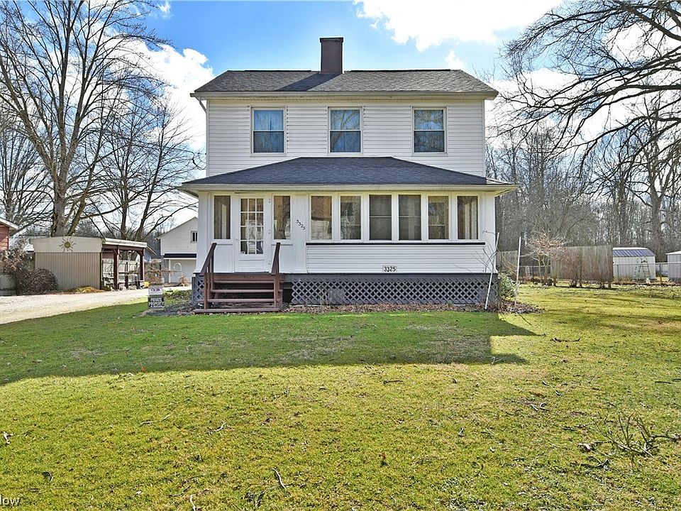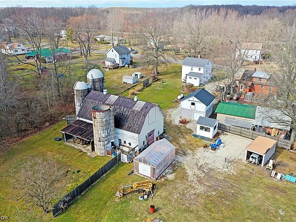 With five acres to include a sizable field, woodlands and a prominent two-story barn, this fantastic Leavittsburg farmhouse is one you won’t want to miss! The property begins with the beautifully presented and artfully crafted home, complete with a nearby covered lounge and pergola walk-through. A detached two car garage offers additional loft space above, while a combination of outbuildings flanks the silo lined barn. The illustrious finished sunroom runs along the front of the home, highlighting the formal entrance, as a pair of side entrances allow for casual daily activities. Thick wood trim lines the heavy door and wooden staircase leading to the second-floor bedrooms as the foyer spills into the inviting living room. Here, a brick fireplace runs along the inside wall as carpeted flooring wraps around to find the sunbathed dining room. Sliding doors offer scenic views as you enjoy your meals. Tiled flooring runs underfoot in the central kitchen as offset countertops bring an open