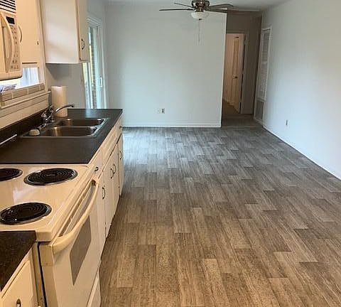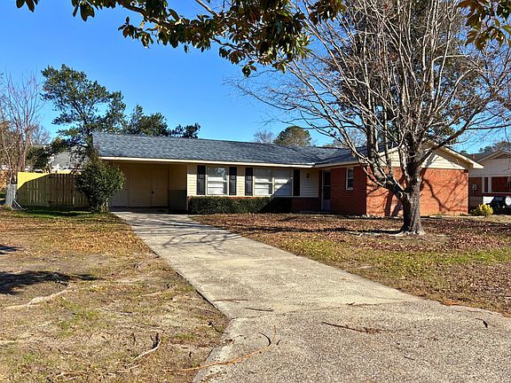 3 bedroom, 2 bath ranch with flat, fenced rear yard and single carport with storage room! Spacious Living Room/Dining Room with carpet! Eat-in Kitchen overlooking rear yard features parquet floors, white cabinets, electric range, and built-in microwave! Primary Bedroom with carpet, 2 closets, ceiling fan, and en-suite bath with tile floors, single vanity, and tub/shower combo! 2 additional bedrooms have carpet and ceiling fans! Full hall bathroom with tile floors, single vanity, and tub/shower combo as well as access to one of the guest bedrooms! Relax or entertain on the back patio! Storage shed remains! Newer HVAC and Water Heater! This home is being sold AS-IS giving you the freedom to update it at your pace and to your liking if you choose! Conveniently located close to shopping, dining, interstate, and schools!