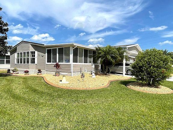Don't miss this one. This is a huge 2 bedroom 2 bath w/ a large den that could be a third bedroom. It has an oversized double carport with a golf cart garage/work shop/storage. This home is fully equipped with tons of updates and upgrades including plantation shutters. You are greeted with tile floors throughout the living area. The living room is enormous and attached to an open kitchen with island/bar. The kitchen is equipped with new stainless steel appliances, including dishwasher. There is plenty of seating at the bar or dining area. Attached is also an airconditioned FL room. Down the hall the den has laminate flooring with a built in desk and shelving. There is also a laundry room with washer and dryer. The second bedroom is oversized with carpet and full width closet that has double doors. Then, the second bath with a shower tub. The master suite is gigantic! It also is carpeted and has a very large walk in closet. The ensuite bath is very spacious with double sinks, sitting area, linen space, and separate updated walk in shower. All of this is located on a corner lot with impeccable landscaping, curbscape, and irrigation. This enormous beauty will not last long.