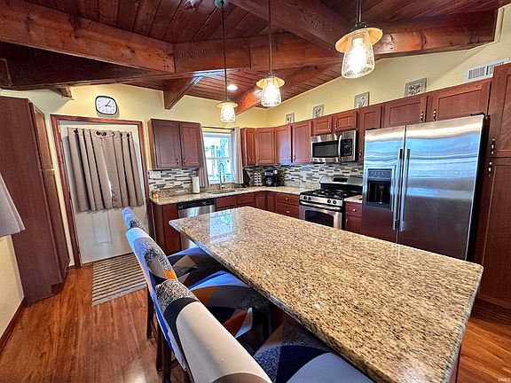 - 1st Bdrm En Suite, Ceiling Fan(s), Beamed Ceilings, Vaulted Ceiling(s), Stone Counters, Eat-in Kitchen, Kitchen Island, Open Floorplan, Stand Up Shower, Tub/Shower Combination, Main Level Bedroom Suite