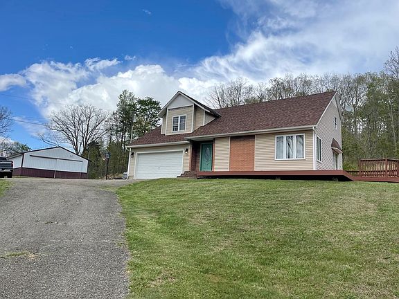 Priced to sell! Motivated seller! This 1.5 story home is move in ready! This lovely home sits on 3.168 acres and has a 30X40 pole barn with bathroom. All kitchen appliances, washer & dryer are included. New roof installed in 2022. Features: large eat in kitchen, open staircase, 4 bedrooms, 2 full baths, deck, 2 car garage. Beautiful views, this home will not last long, call today for a private viewing!