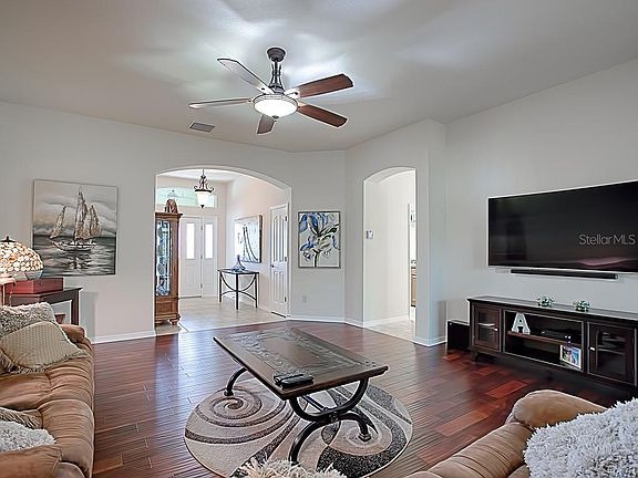 LOVELY FURNISHED 3/2 HOLLY DESIGNER located in the Village of COLLIER! This home has great curb appeal with a cemented stamped design driveway, stacked stone curbing with lovely landscaping! This unique model has a COAT CLOSET in the foyer with 18" TILE flooring which you will also find in the kitchen, baths and laundry! Beautiful HARDWOOD enhances the living room and all bedrooms! This is a NO CARPET home! Fabulous kitchen offers so much counter space and cabinets with an island, an EAT-IN area for casual dining and a convenient built in desk! Lovely high definition laminate beveled edge counter tops, deep stainless sink, TILED BACKSPLASH, over and under counter lighting, STAINLESS appliances, double door PANTRY, pull out drawers and PENDANT lighting over the island! The dining room is conveniently located right off of the kitchen with a full wall of windows for more natural lighting! Plenty of space in the generous living room and remember -- this HOME IS FURNISHED! The sliding glass doors open out to the glass enclosed "all year round" lanai with beautiful TRAVERTINE flooring! Behind the home you will find low maintenance landscaping with rocks and PRIVACY shrubs! The 2 guest rooms are located in the front of the home; one with a tray ceiling and walk-in closet and the other with vaulted ceilings and double door closet. The guest bath has a custom framed mirror with tub and lovely tiled shower! The master bedroom has a large wall mounted TV and an en-suite master bath with his and hers closets with extra shelving, his and hers sinks, a vanity, framed mirror, ROMAN SHOWER and separate toilet room! Conveniently located just minutes to Brownwood Paddock Square, shopping and dining! COME SEE ALL THIS HOME HAS TO OFFER! GREAT PRICE - GREAT HOME!