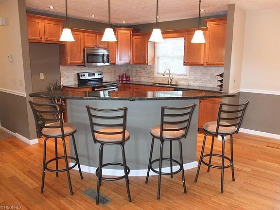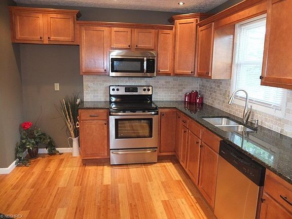 Updated 3 bedroom, 2 full bath bi-level with new flooring throughout, beautifully remodeled kitchen and fully fenced private backyard! Open concept on main level. Living room opens to kitchen, both with bamboo hardwood flooring and chair rail. Remodeled kitchen has breakfast bar, granite countertops and dinette and comes applianced with new stainless steel electric range and stove, over the range microwave and dishwasher. Master bedroom has direct access to full bath. Full bath on main level has tile flooring, shower with tile surround and solid surface countertop. 2 additional bedrooms complete the main level. Finished walkout lower level has family room with beautiful stone fireplace and full bath with tile flooring and updated vanity. 2 car side load garage, too! Fully fenced private backyard offers covered patio and storage shed. Call today to schedule a private showing!