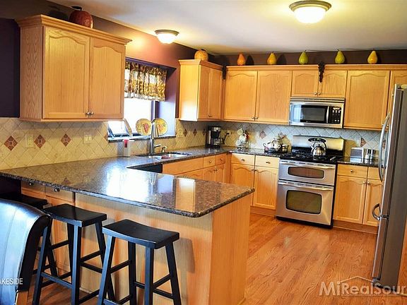 Gorgeous colonial home on a lovely cul-de-sac in Sterling Heights. Kitchen features Merillat oak cabinets, new granite counters, new ceramic back splash, under cabinet lighting, stainless steel appliances, and a side island with breakfast bar. The great room has a gas fireplace, crown molding, eyeball & recessed lighting. Master Suite has bonus room closet with built-ins, and bathroom has huge walk in shower, dual vanities, and travertine tile throughout. Home also features 1st floor laundry (new washer and dryer), finished basement with wet bar, full bathroom with shower and Jacuzzi tub, sump pump with water backup, humidifier on furnace, and new 3D shingle roof. The backyard has a stamped concrete patio, shade garden, in-ground sprinklers, and a private 28 x 42 basketball court.