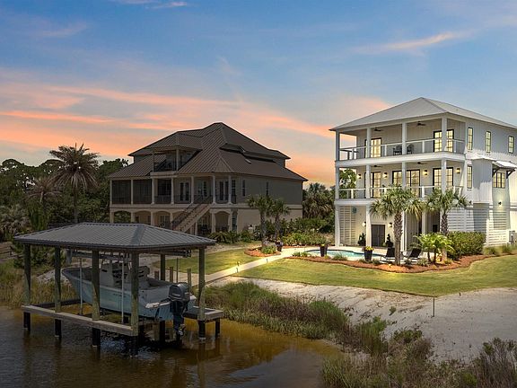 Experience refined coastal living in this exquisite custom-built Phillip Pouncey home, ideally situated on a canal in the prestigious gated community of Ono Island. This 3,310 sq ft residence offers exceptional craftsmanship and high-end materials throughout, including copper piping, Kolbe impact-resistant Low-E windows, OSB board, and luxurious finishes. The open-concept design includes 4 spacious bedrooms, 3 full and 2 half baths, with expansive water views from every floor. The main level features a chef’s kitchen with premium stainless appliances, including a Wolf gas range and Sub-Zero refrigerator, granite countertops, a large island, and dry bar with Scotsman Nugget ice maker. Adjacent spaces include a laundry room and a half bath. The living room boasts a gas fireplace, electric blinds, and access to waterfront balconies perfect for enjoying sunsets. The master suite offers a spa-like retreat with double vanities, a jetted tub, walk-in shower, and dual closets. A convenient elevator leads to the upper level, where you’ll find three additional bedrooms—including a second master suite—a spacious family room with wet bar, beverage fridge, and another ice maker. Outdoor living is just as luxurious, with a saltwater gunite pool, gas firepit, and a covered entertainment area complete with a large wet bar, flat-screen TV, roll-down sunshade, and plenty of space for gatherings. Boaters will appreciate the 24-foot covered boat slip with 10,000 lb lift and flow-through decking, offering direct Gulf access. Additional features include a whole-house Generac generator, wood-look tile in main areas, carpeted bedrooms, two large storage rooms, a walk-in pantry, and covered parking suitable for boats. Fully furnished and beautifully landscaped, this turnkey property offers the best in upscale island living. Ono Island has a surplus of amenities, including 24-hour security checkpoint at the Ono bridge, indoor and outdoor swimming pools, tennis and pickleball courts and more!