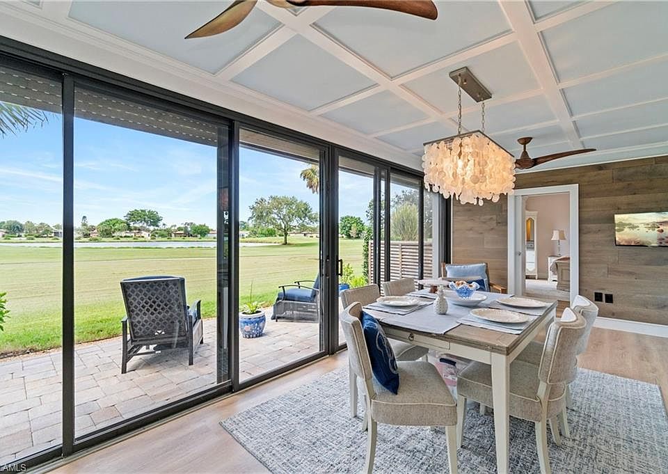 REMODELED VILLA – LAKE VIEWS – LOW FEES! Enjoy panoramic views of the lake and golf course from this beautifully decorated 2BR/2BA villa with Florida room, offering the feel of a single-family home. Completely remodeled, the bright kitchen features quartz countertops and updated appliances. This home showcases exquisite craftsmanship with custom woodwork throughout—from detailed ceiling and wall accents to thoughtfully designed built-in shelving and storage. The pantry includes custom shelving for maximum functionality, while the closets are finished with elegant built-ins that combine beauty and organization. The floors and bathrooms have been completely remodeled, with both bathrooms equipped with custom walk-in bathtubs, making this home perfect for accessibility needs. Additional upgrades include automatic hurricane shutters, a newer roof, new front garage door, and a beautiful paver patio. The Florida room provides extra square footage (not included under air), while lush tropical landscaping surrounds the property. With very low fees and a prime Naples location, this villa is a rare opportunity not to be missed.THIS PROPERTY QUALIFIES FOR A 1% LENDER INCENTIVE IF USING PREFERRED LENDER, FHA AND VA LOANS ACCEPTED. INQUIRE FOR MORE DETAILS**